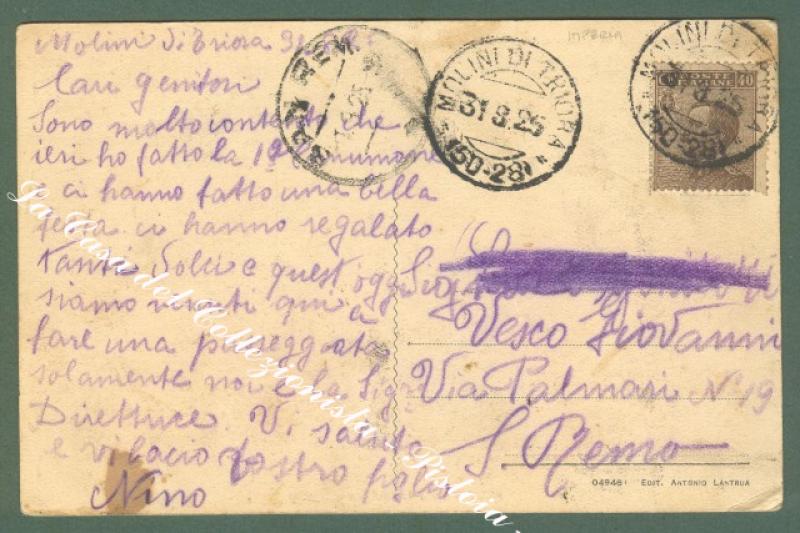 Liguria. MOLINI DI TRIORA, Imperia. Cartolina d'epoca viaggiata nel 1925. Ingiallimenti. (Rif.D988)