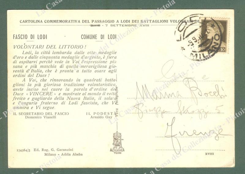 LODI. FASCIO DI LODI. Cartolina d'epoca commemorativa del passaggio dei battaglioni del littorio.