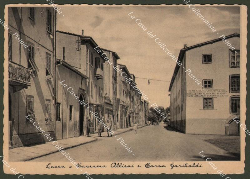LUCCA, Caserma allievi e Corso Garibaldi. Cartolina formato grande (cm 15x10,5), circa 1940. Ottima conservazione. (Rif.D7238)
