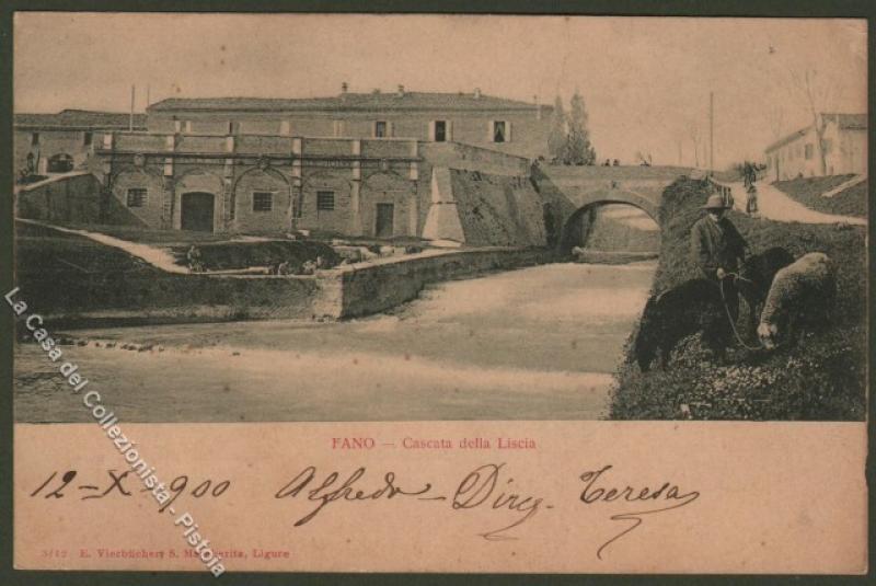 Marche. FANO, Pesaro. Cascata della Liscia. Cartolina d'epoca viaggiata nel 1900. Ottima conservazione. (Rif.D275)