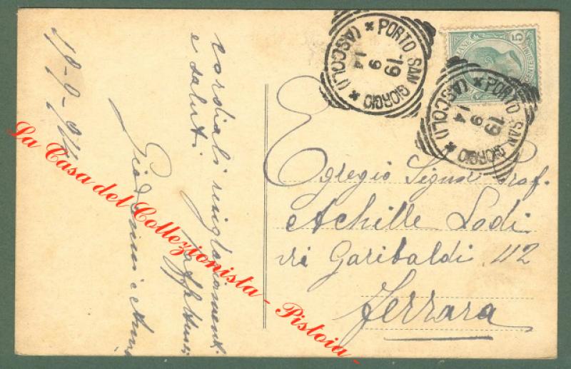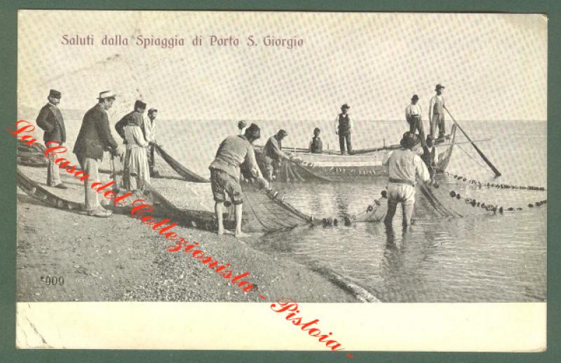 Marche. PORTO S. GIORGIO, Ascoli. Saluti dalla spiaggia di Porto S. Giorgio. Cartolina d'epoca viaggiata nel 1914. Ottima conservazione. (D788)