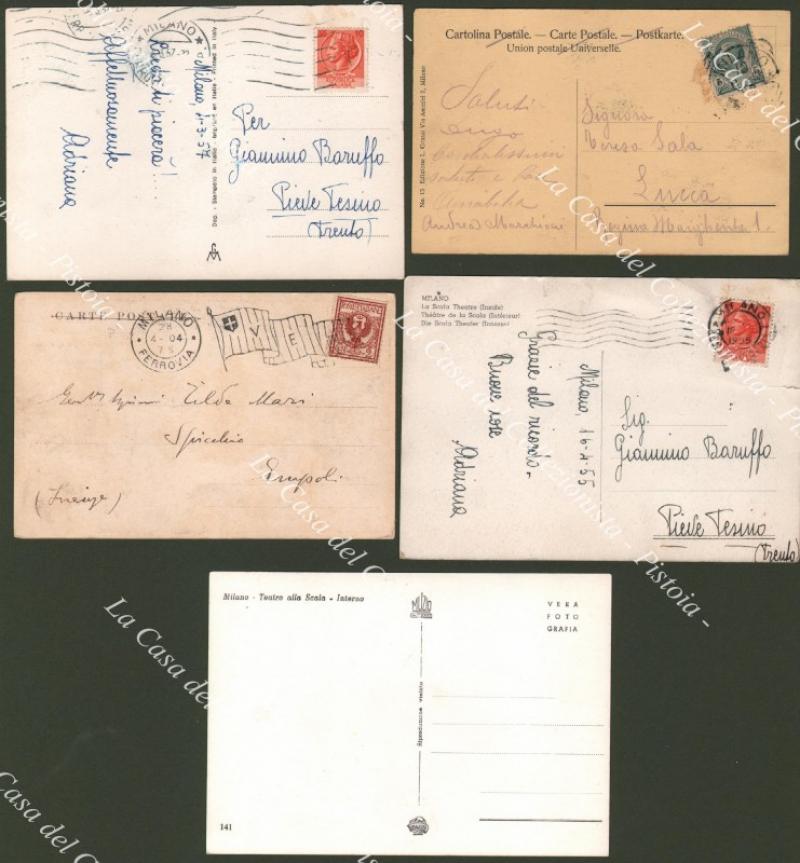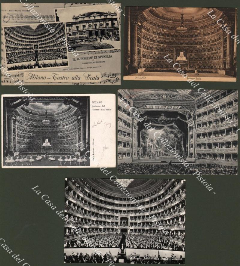MILANO. Teatro alla Scala. 5 cartoline di cui 4 viaggiate 1904, 1908, 1955 e 1957