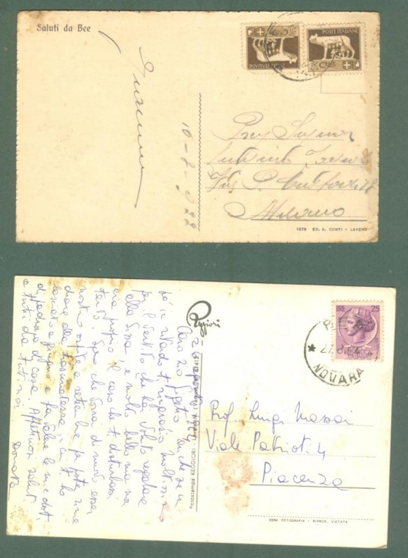 Piemonte. BEE, Novara. Due cartoline d'epoca viaggiate nel 1922 e nel 1964. Qualche difetto. (Rif.D4730)