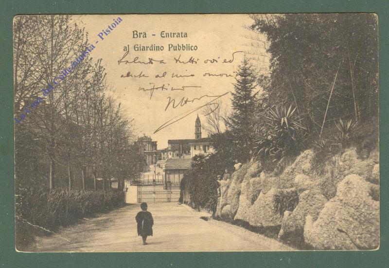 Piemonte. BRA, Cuneo. Entrata al Giardino Pubblico. Cartolina d'epoca viaggiata nel 1913. Piega all'angolo sinistro inferiore. (Rif.D5706)