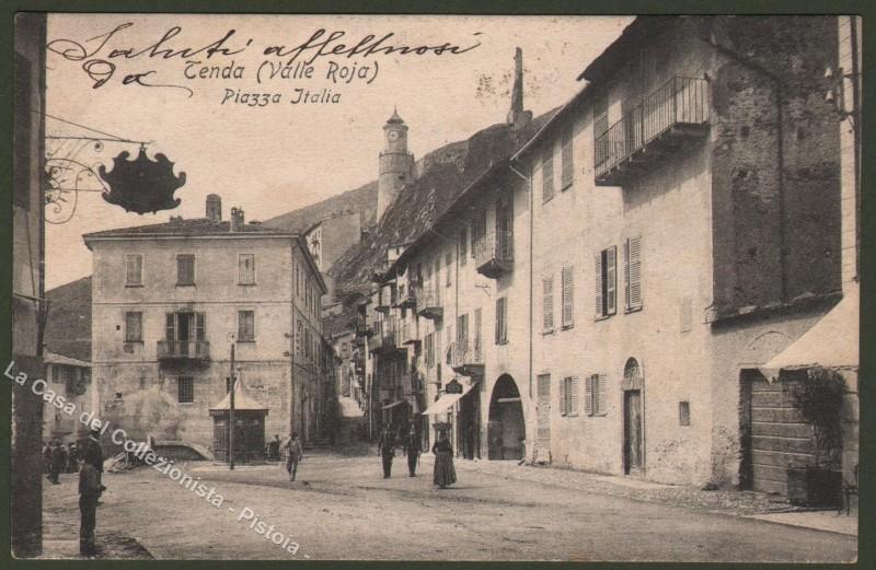 Piemonte. TENDA, Cuneo. Piazza Italia. Cartolina d'epoca viaggiata nel 1904. Ottima conservazione.