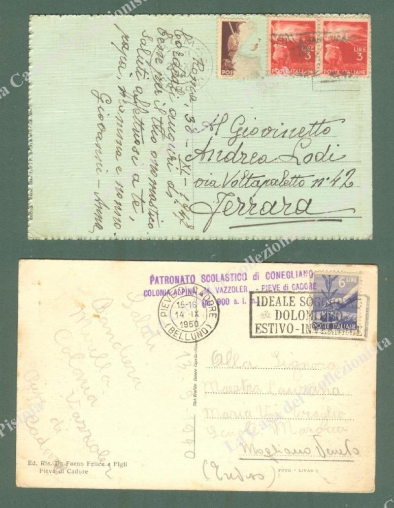 PIEVE DI CADORE, Belluno. 2 cartoline d'epoca viaggiate nel 1947 e 1950