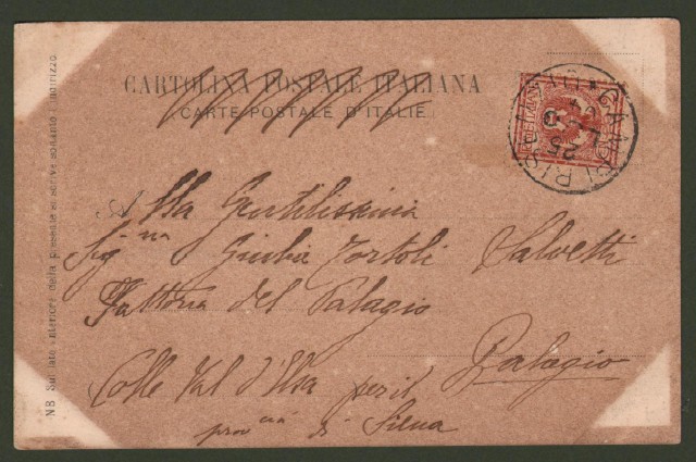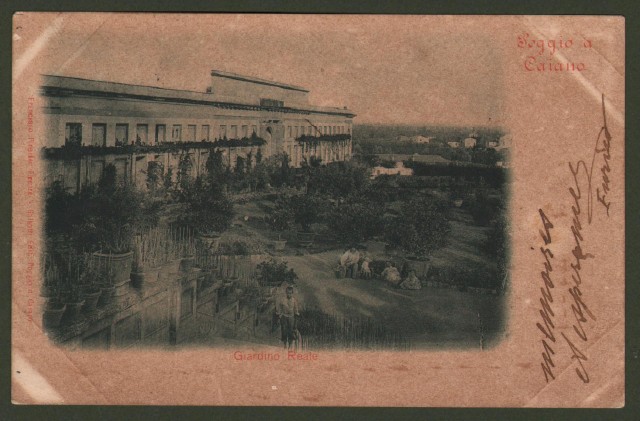 Poggio a Caiano (Prato). Giardino Reale. Cartolina d'epoca viaggiata nel 1904. Brunita con segni agli angoli (visibili soprattutto a retro) dovuta ad antica collocazione in album. (Rif.C8340)