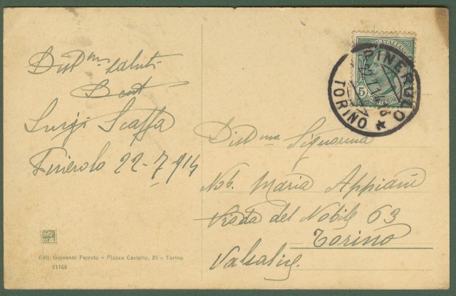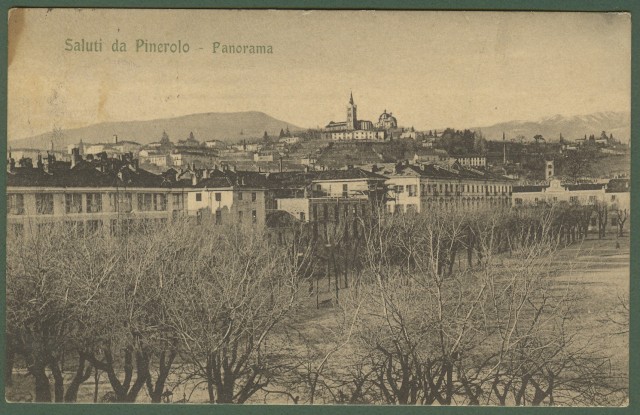 Saluti da Pinerolo - Panorama. Viaggiata nel 1918. Brunitura in un angolo. (Rif.B4573)