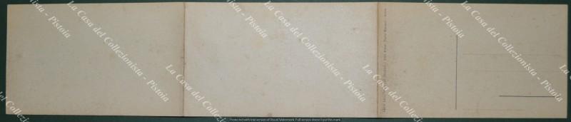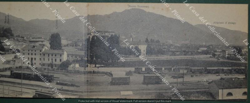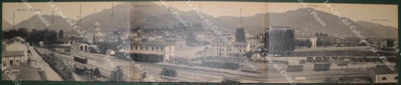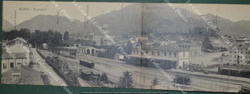 SCHIO, Vicenza. Panorama e interno stazione. Cartolina tripla, non viaggiata, circa 1920.