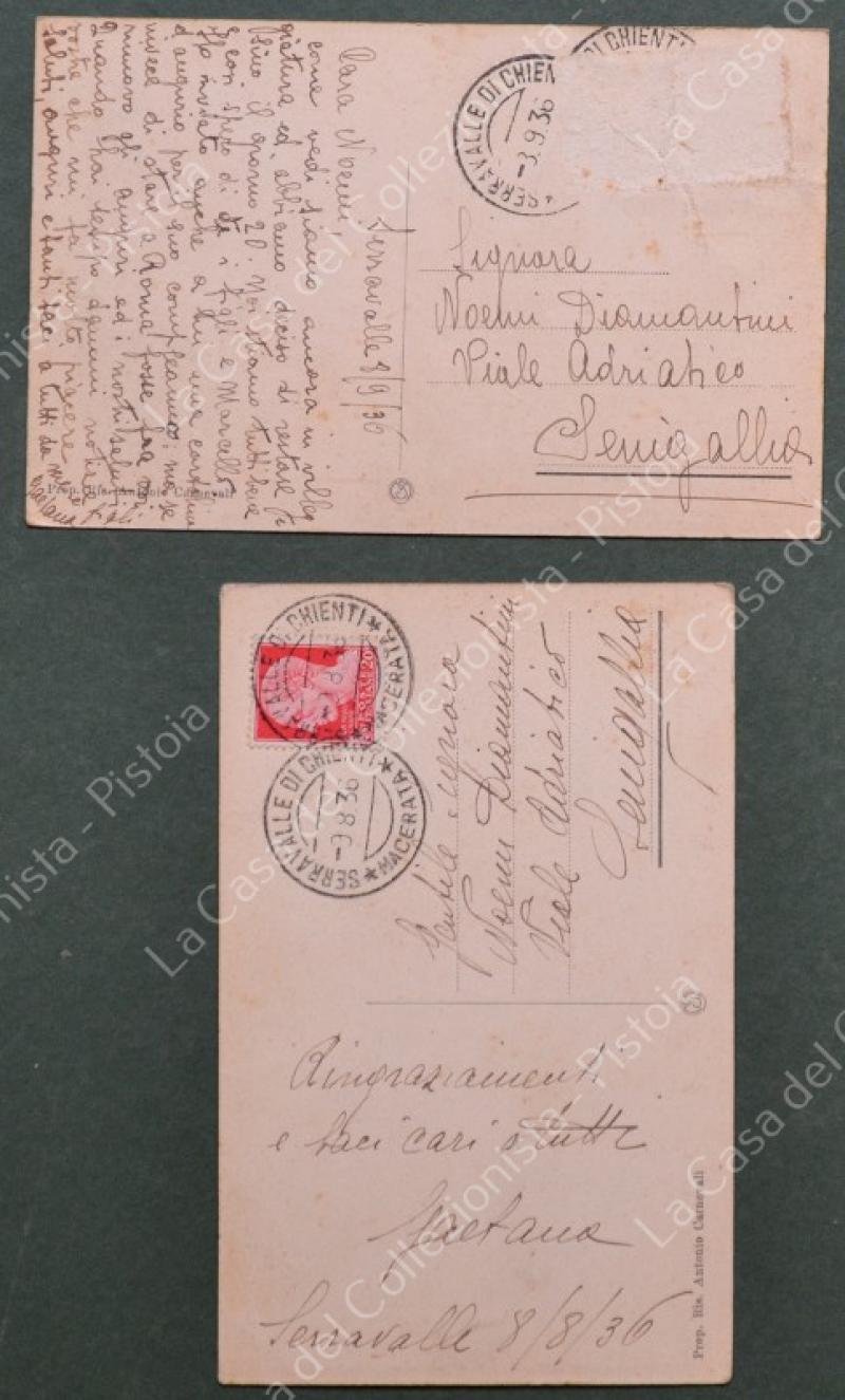 SERRAVALLE DI CHIENTI, Macerata. 2 cartoline d'epoca piccolo formato, viaggiate nel 1936. Danni a retro di una per asportazione del francobollo. (Rif.F5433)