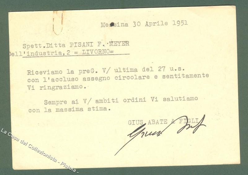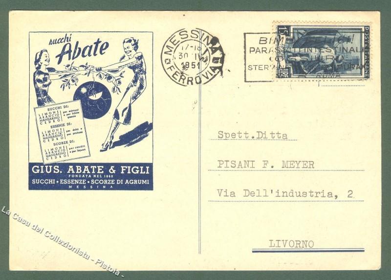 Sicilia. MESSINA. Ditta Abate & Figli. Succhi - Essenze - Scorze di agrumi. Cartolina viaggiata nel 1951. Formato grande. A retro segnetto di grappetta. (Rif.D324)
