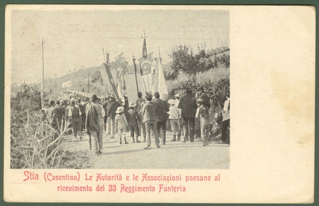 Stia (Arezzo). "Stia (Casentino) Le Autorità e le Associazioni paesane al ricevimento del 33 Regg. Fanteria". Cartolina d'epoca non viaggiata, inizio '900, buona conservazione. (Rif.B4193)