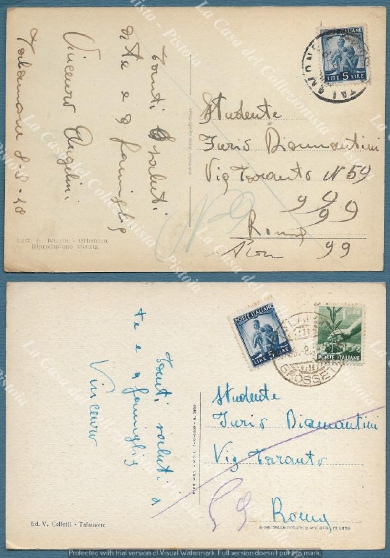 TALAMONE, Grosseto. Due cartoline, formato grande, viaggiate nel 1948 e 1949.