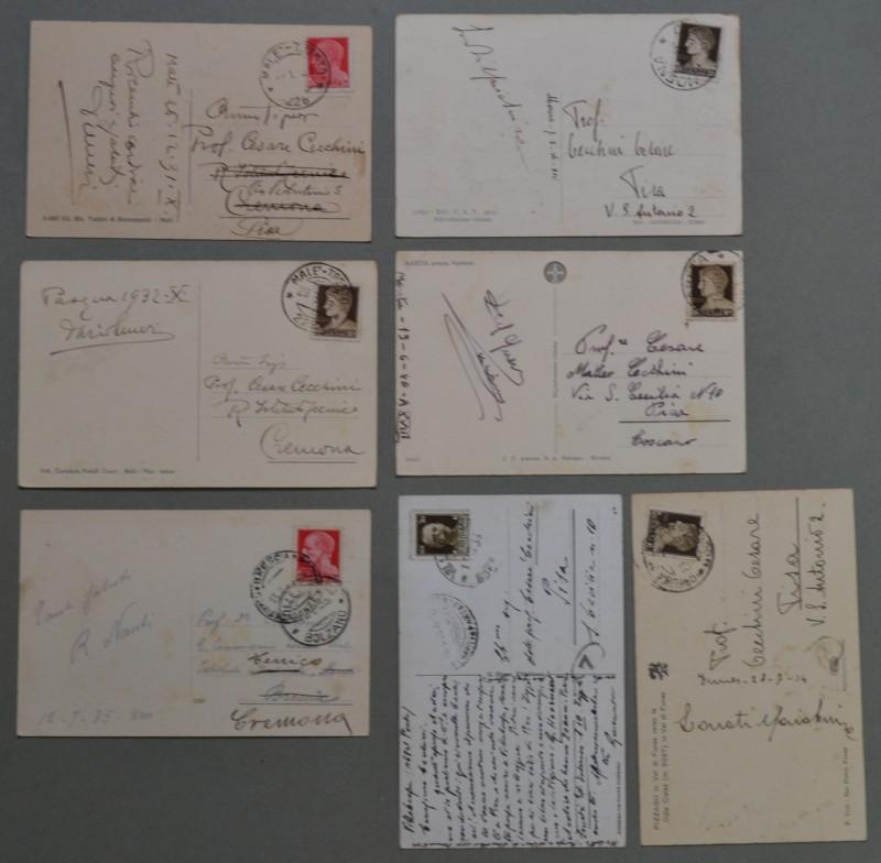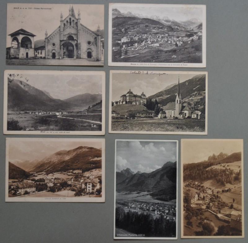 TRENTINO. Sette cartoline d'epoca 1931/1940 spedite da Malé (2), Colle Isarco, Moena, Mareta, Villabassa, Pinzago. Ottima conservazione. (Rif.D2776)