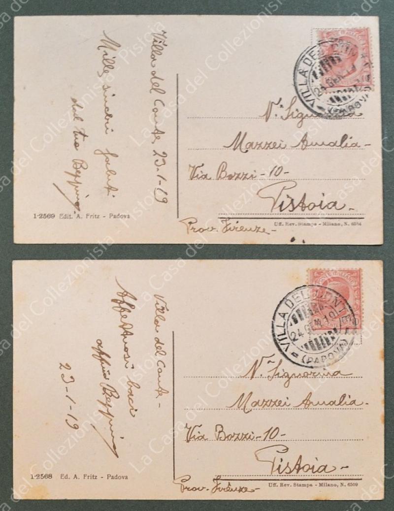 VILLA DEL CONTE, Padova. 2 cartoline d'epoca formato piccolo, viaggiate nel 1919: Villa Piacentini e Villa Marini. (Rif.F7173)