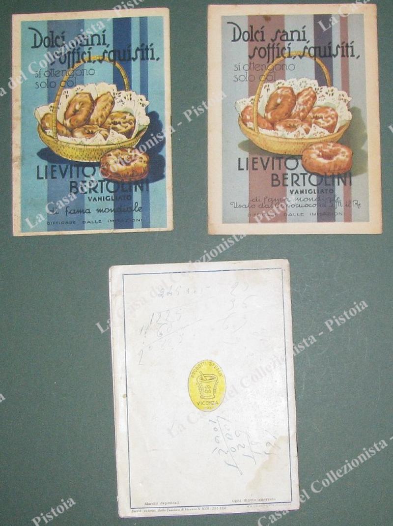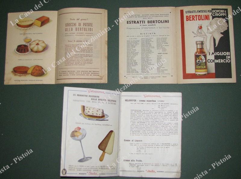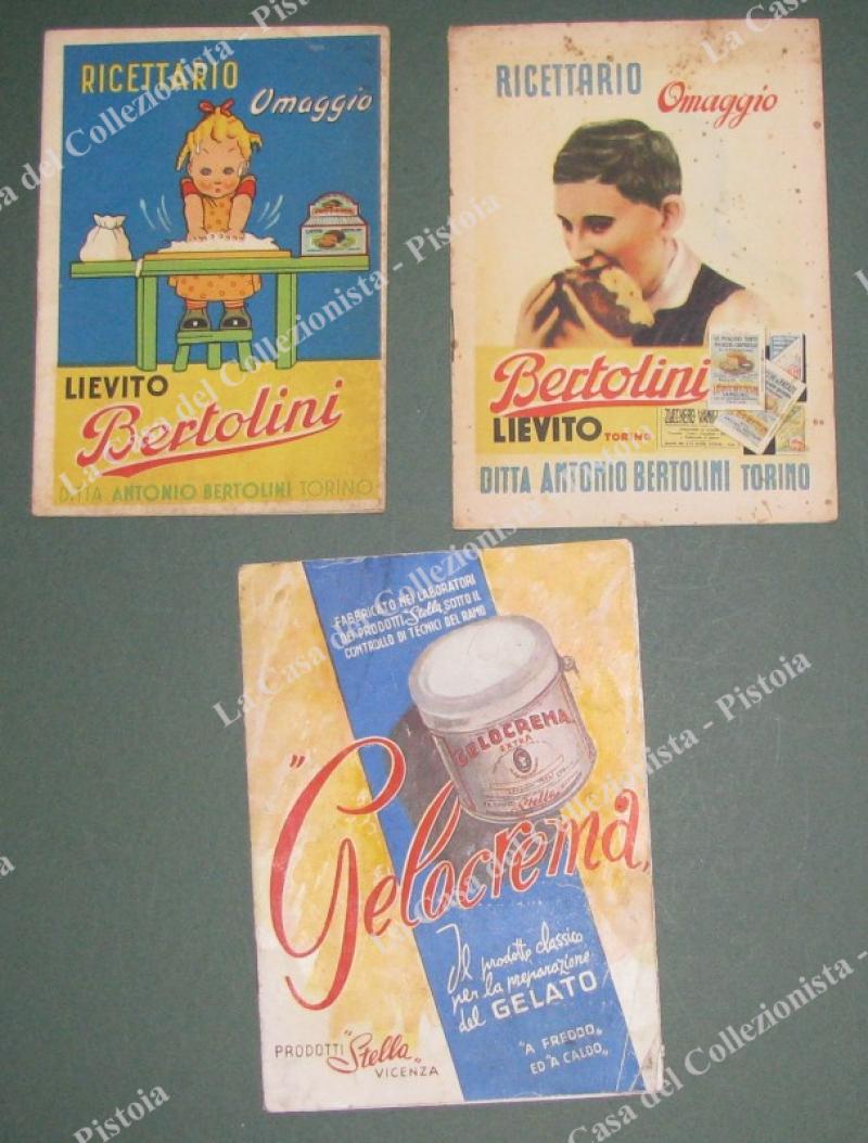 3 RICETTARI ILLUSTARTI. 2 Lievito Bertolini (anno 1838), 1 Gelocrema gelato (anno 1950, qualche difetto). Ciascuna di varie pagine con illustrazioni. (Rif.E0809)