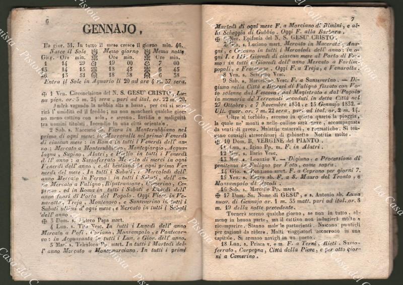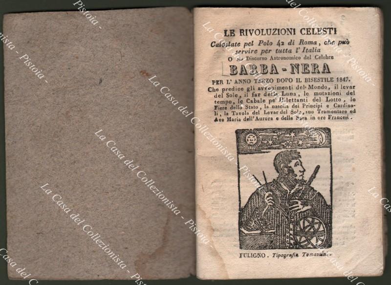 Anno 1847. ALMANACCO. BARBA NERA. MOTI CELESTI O SIANO PIANETI SFERICI calcolati per tutta l’Italia e sue Isole e per gran parte di Europa, ed in particolare per il Polo 42 di Roma e 41 di Napoli. Levar del Sole, mutazioni della Luna, Cabale per il gioco del Lotto, le Fiere, ecc.. Pagine 64 con, per ogni mese, 12 xilografie nel testo, brossura muta del tempo. Lievi usure. (Rif.D9439-77/72)