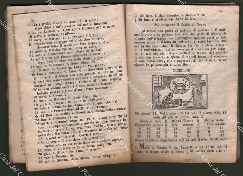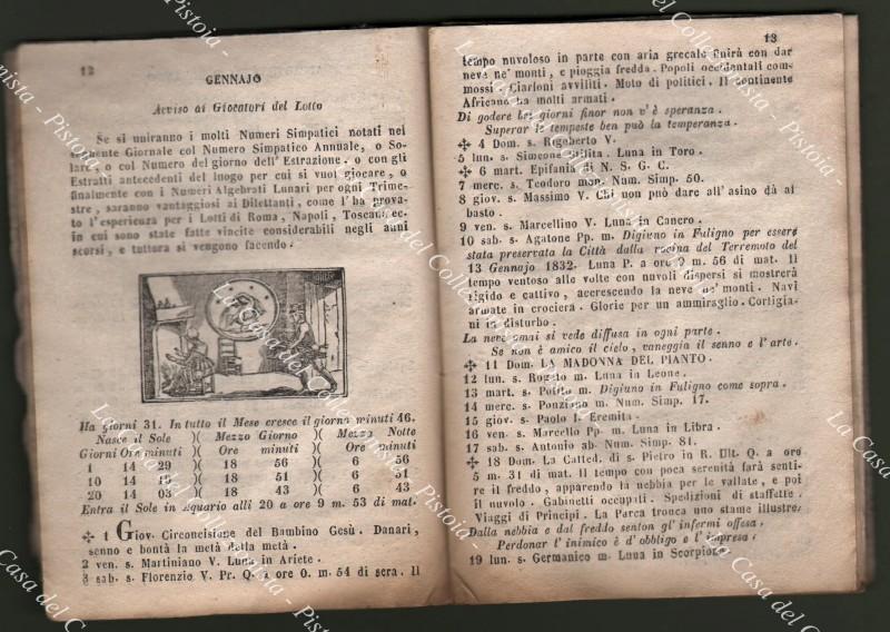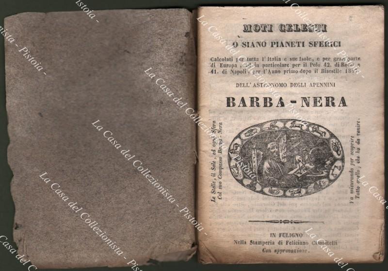 Anno 1857. ALMANACCO. BARBA NERA. MOTI CELESTI O SIANO PIANETI SFERICI calcolati per tutta l’Italia e sue Isole e per gran parte di Europa, ed in particolare per il Polo 42 di Roma e 41 di Napoli. Levar del Sole, mutazioni della Luna, Cabale per il gioco del Lotto, le Fiere, ecc.. Pagine 64 con, per ogni mese, 12 xilografie nel testo, brossura muta del tempo. Qualche ingiallimento, aloncino e piccole usure. (Rif.D9435-77/72)