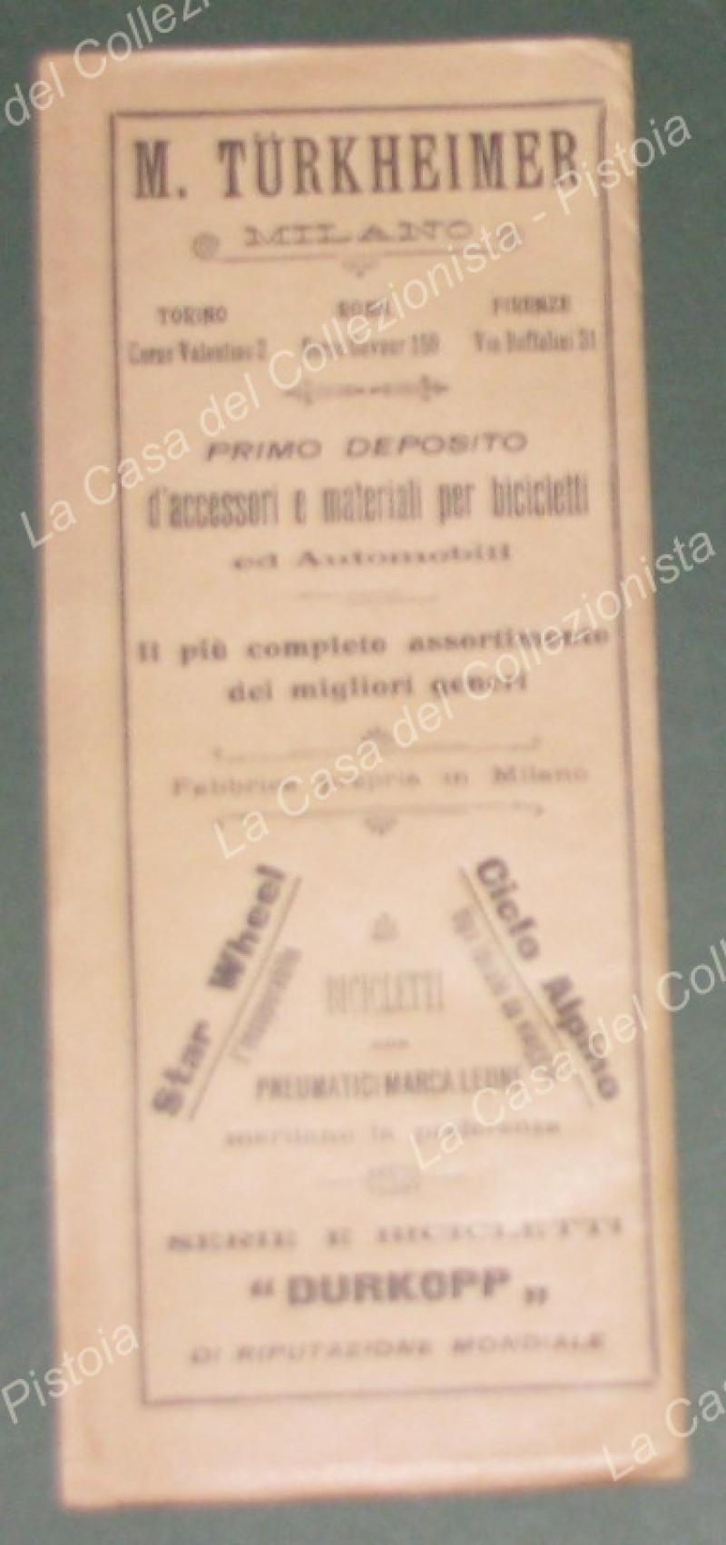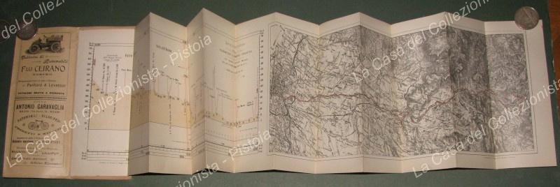 ARSOLI-TIVOLI-ROMA. Planimetria e profilo ciclistico. Anno 1901. Graziosa cartina edita dal Touring Club Ciclistico Italiano contenuta in brossura editoriale e piegata a fisarmonica. MM 940x210. Nella prima parte l'altimetria del percorso con note sulla pendenza e lo stato delle strade; nella seconda parte la certina topografica della zona. Aperta la cartina misura cm 98,5x21,5. (Rif.E4217)