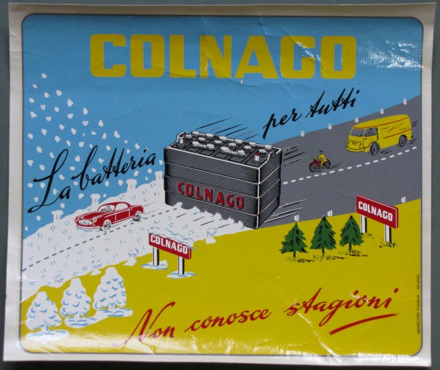AUTO. Bella decalcomania disegnata a colori pubblicitaria BATTERIA COLNAGO. Cm 25x21, anni '50, ottima conservazione. (Rif.B4848-62/52)