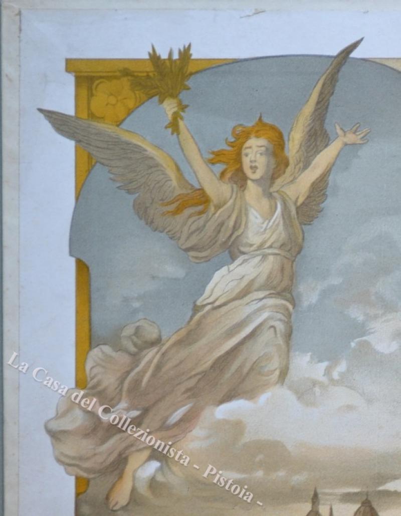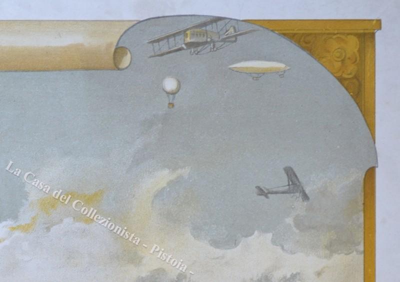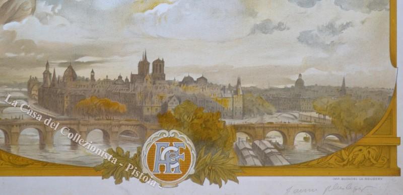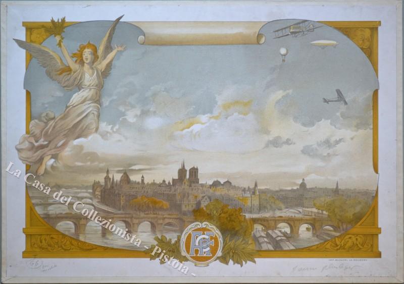 AVIAZIONE FRANCESE. Veduta a volo d’uccello di Parigi con il ponte della Senna in primo piano, l’Ile de France al centro; in cielo aerei, dirigibili, pallone e donna alata, emblema con foglie d’alloro alla base. Il tutto racchiuso in cornice a carattere architettonico. Firmato G.G. alla base, Impr. Blondel La Rougery, circa 1924. Cromolitografia di mm 280x410 applicata su cartoncino. Finissima spettacolare prova di stampa di diploma di partecipazione realizzato per la Conferenza dell’Aviazione di Parigi del 1924. Rara e decorativa. (Rif.D1765-57/65)