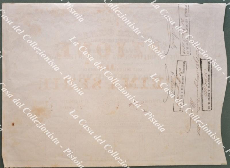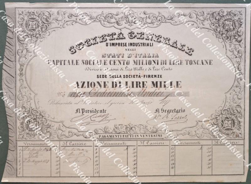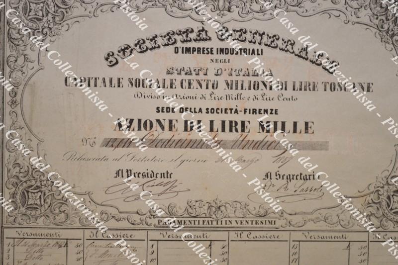 AZIONE anno 1857. SOCIETA’ GENERALE D’IMPRESE INDUSTRIALI STATI D’ITALIA. Firenze 1857. Azione al portatore di lire 1000.