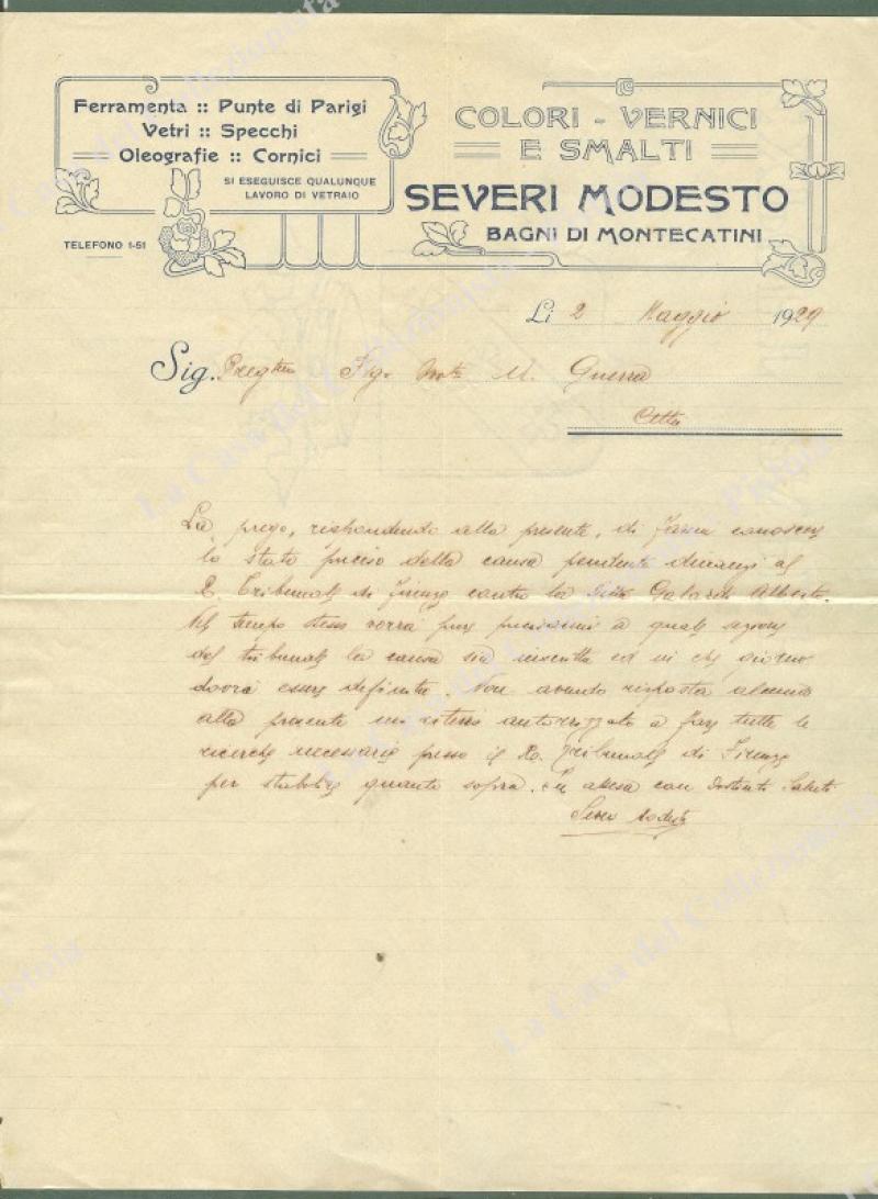 BAGNI DI MONTECATINI. Colori e vernici Severi. Lettera intestata anno 1929. (Rif.E3281)