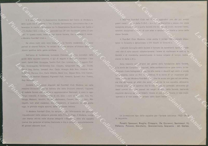 CALCIO. F. C. MODENA. Inizio anni '50. Stemma originale in cromolitografia su tavola di cm 34x24. Unita pagina con la storia della società. Ottima conservazione.