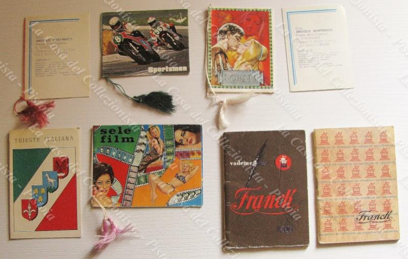 CALENDARIETTI 8 pezzi: ANNO 1967. Sele Film. Pagine 6. 2) ANNO 1954. Trieste italiana. Pagine 4. 3) ANNO 1965. Nettuno. Pagine 4. 4) ANNO 1979. Norma. Pagine 12. 5) ANNO 1978. Sportsmen. Pagine 8. 6) ANNO 1965. Pascale Petit. Pagine 4. 7) ANNO 1957. Vademecum Franck. Pagine 64. Difetti. 8) ANNO 1961. Vademucum Frank. Pagine 64. (Rif.E4963)