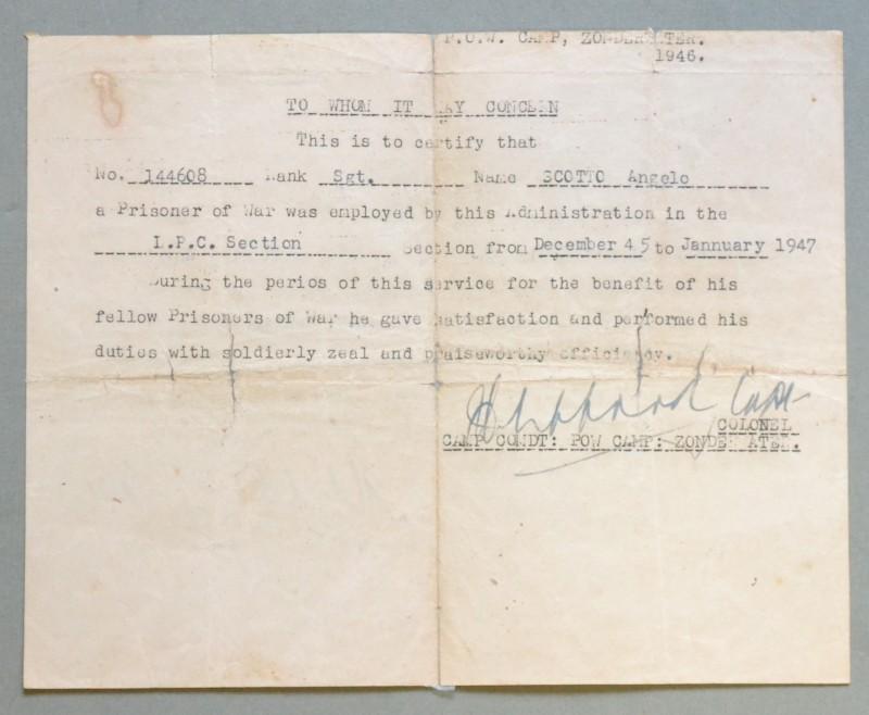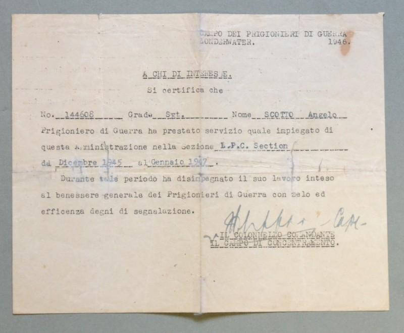 CAMPO DI CONSENTRAMENTO, PRIGIONIERO DI GUERRA. Attestato di buon comportamento rilasciato nel 1947. Bilingue (italiano - inglese). Qualche difetto. (Rif.D4194)