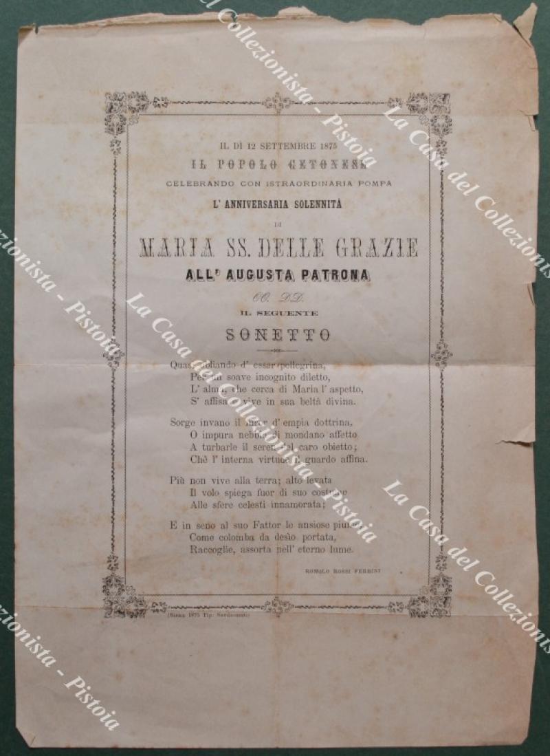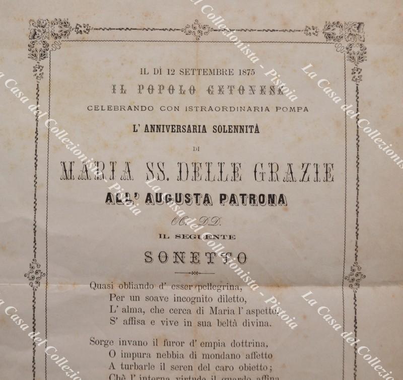 CETONA, Siena. Sonetto del 1875 per il solenne anniversario della Patrona di Maria SS. Delle Grazie. Cm 21x30. Piccole imperfezioni. (Rif.F7660)