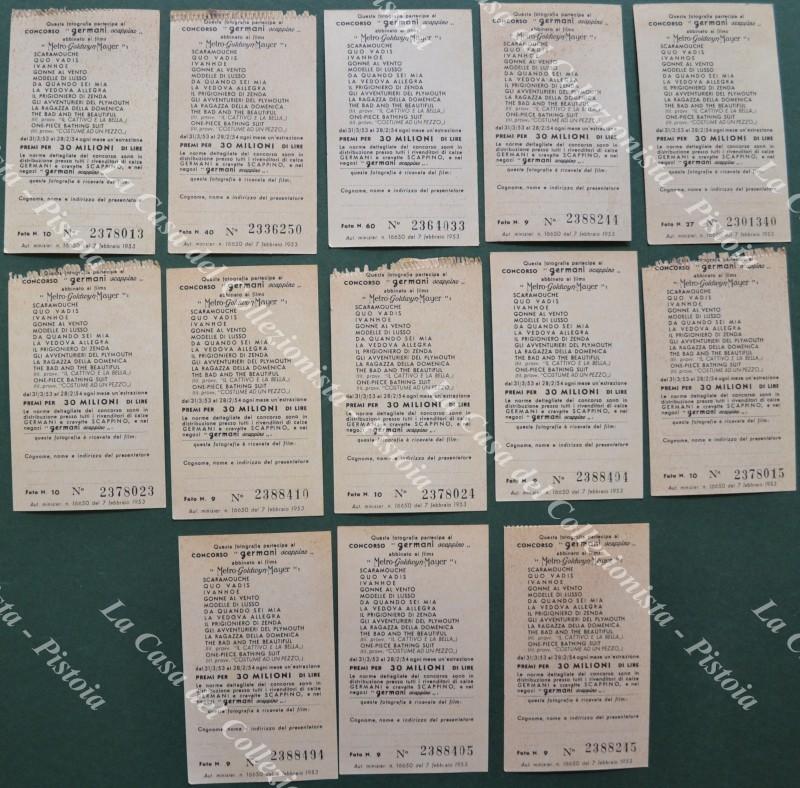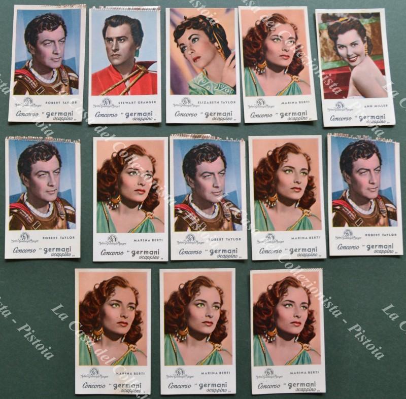 CONCORSO A PREMI GERMANI SCAPPINO anni 1953 - 1954 abbinato ai film Metro Goldwyn Mayer. Figurine, ciascuna con il suo numero progressivo, raffigurante attrici e attori. 11 figurine (5 tipi diversi). Quattro hanno il bordo superiore irregolare. (Rif.F4066)