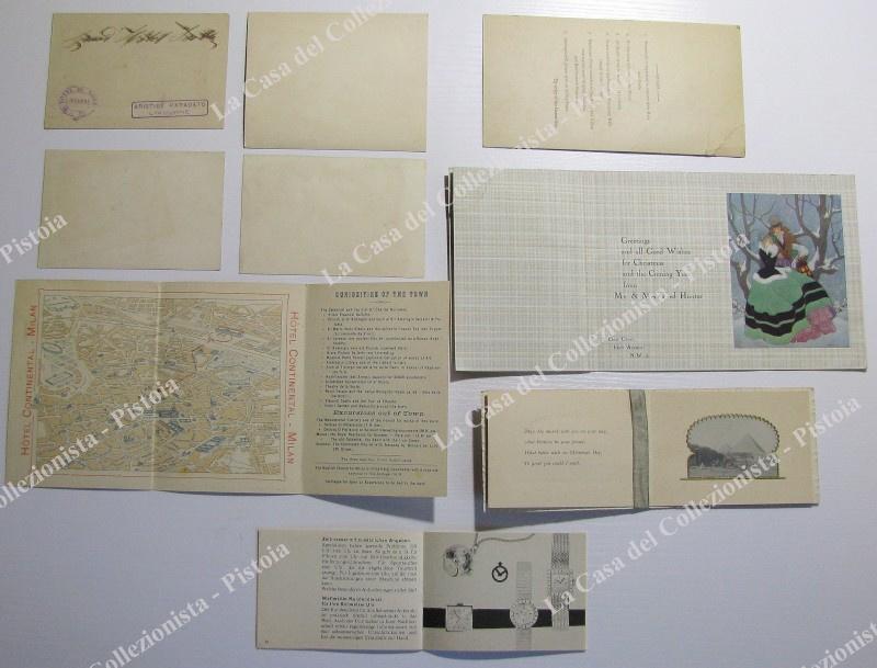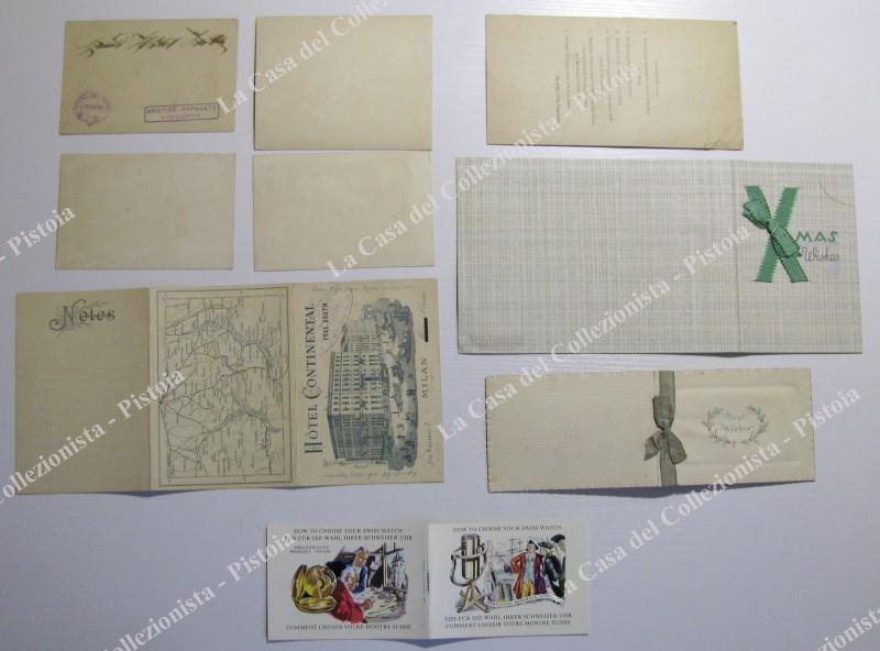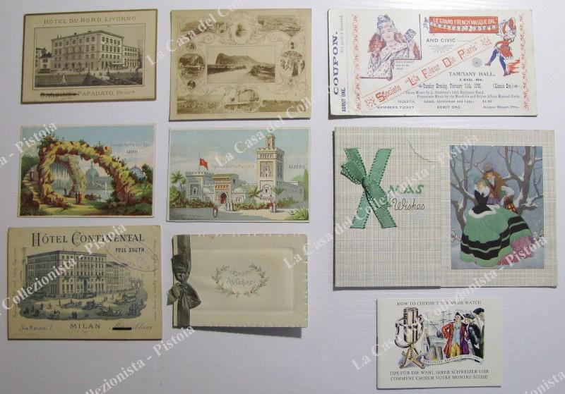 CURIOSITA' DI CARTA. Insieme di 9 pezzi così composto: 1) Gibilterra. Foto all'albumina fine '800 di cm 12x9,5 con veduta generale e altre 8 piccole immagini. 2) Depliant illustrato di 16 pagine pubblicitario orologi svizzeri. Anni '30. 3) Due cromolitografie di cm 11x8 pubblicitarie della Esposiz. Universale 18+8 di Parigi. 4) Due cartoncini (uno composto da tre parti ripiegato) pubblicitari Hotel Du Nord di Livorno. Inizio '900. 5) Due libretti augurali anni '30 (uno ha uno strappo). 6) Un biglietto del 1896 per un ballo in mascherato a Parigi (piegoline). (Rif.E3727)