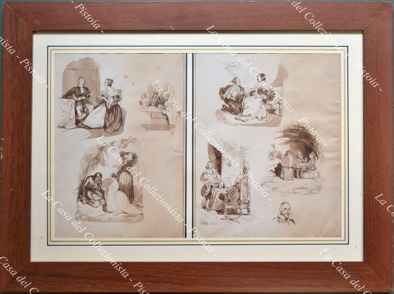 DUE ACQUARELLI del 1831. Fogli di mm 210x270 e mm 190x270 montati in modesta 19 cornice recente in legno di cm 57x42. Ogni foglio contiene tre acquarelli monocromi probabilmenti ispirati all’opera di W. Scott Lucia di Lammermor; su uno, in basso a destra “September 1831”. Buona conservazione. (Rif.D9142-79/72)