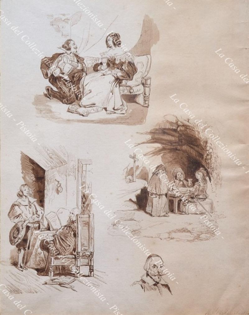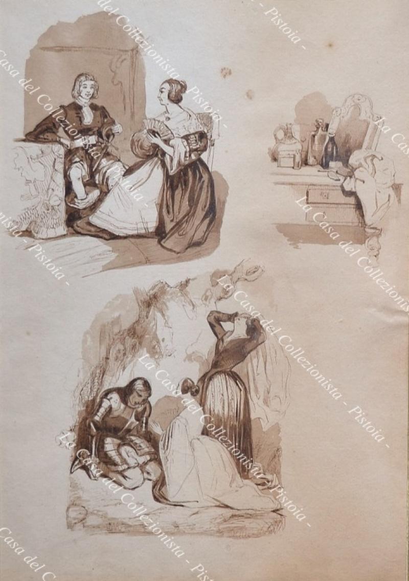 DUE ACQUARELLI del 1831. Ogni foglio contiene tre acquarelli monocromi probabilmenti ispirati all’opera di W. Scott Lucia di Lammermor