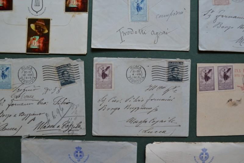 ERINNOFILIA. 6 lettere e 1 cartolina postale viaggiate tra il 1913 ed il 1915. Sei (colori diversi) del Comitato Romano Organizzazione Civile; una con tre chiudilettera pubblicitari di una lampada economica. Conservata la corrispondenza. (Rif.F7012)