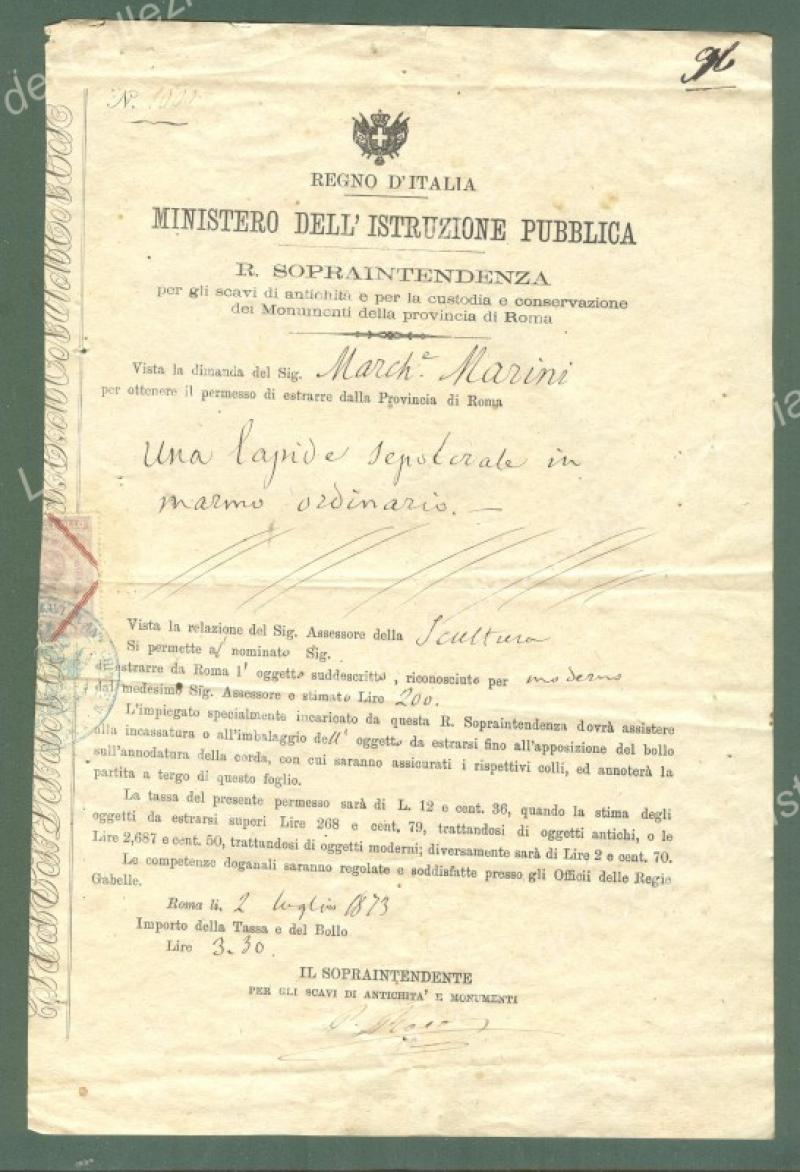 ESTRAZIONE DI UNA LAPIDE SEPOLCRALE IN MARMO. Permesso della R.Sopraintendenza per gli scavi d'antichità.Documento del 1873, cm 18x27. (Rif.E4146)