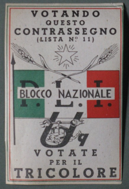 Etichetta adesiva di propaganda del Blocco Nazionale. A colori, cm 7,5x12. Circa 1948. (Rif.B5576)