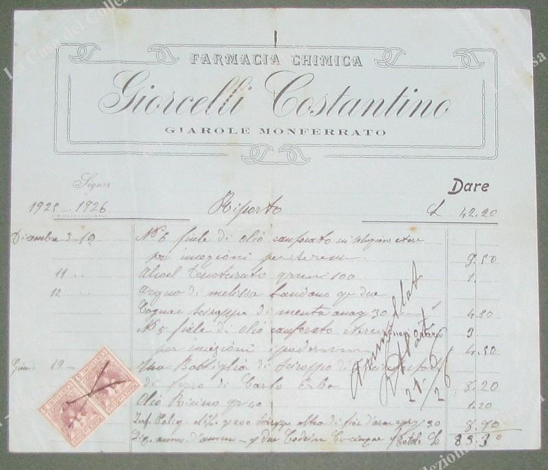 FARMACIA GIORCELLI, Giarole Monferrato, Alessandria. Vecchia conto 1926. Imperfezioni.