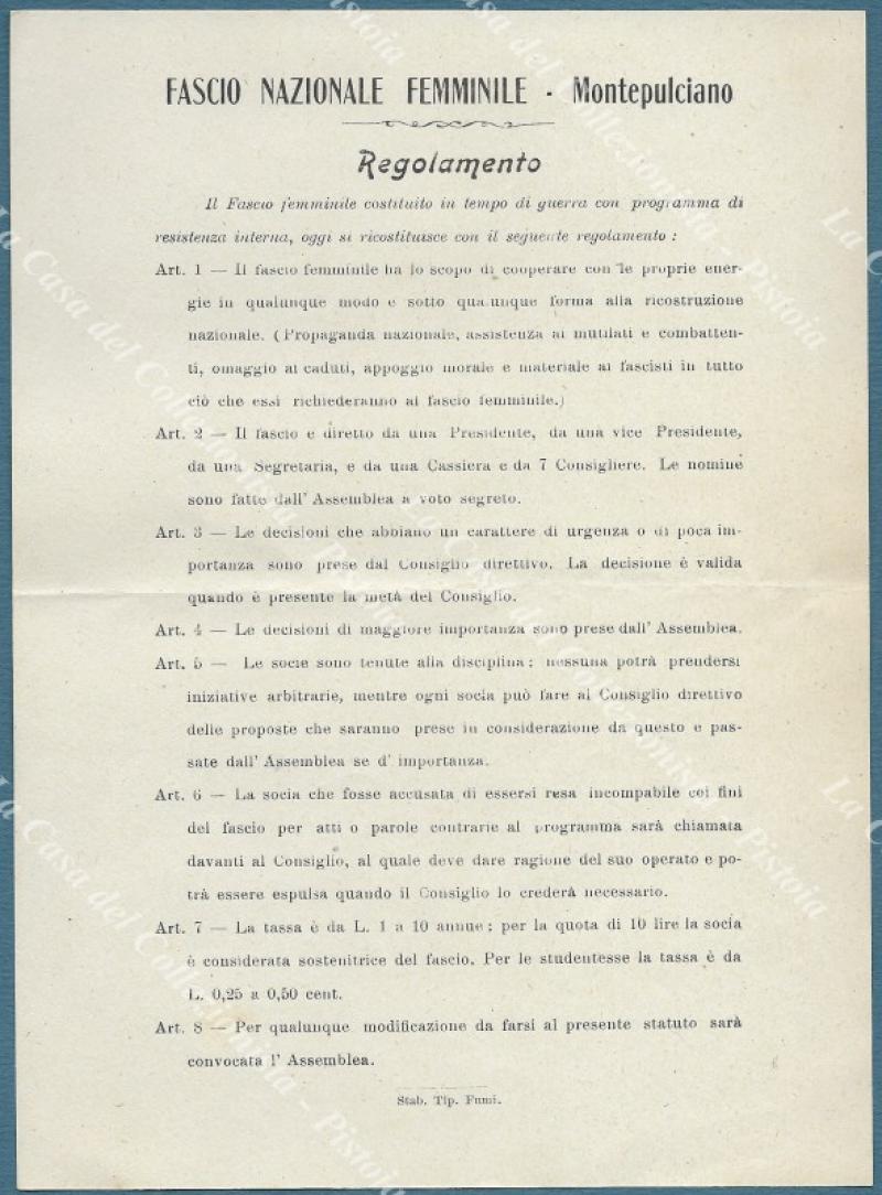 FASCISMO - MONTEPULCIANO, Siena. Regolamento del FASCIO NAZIONALE FEMMINILE - MONTEPULCIANO. Foglio di cm 16x22. Senza data (circa 1940)