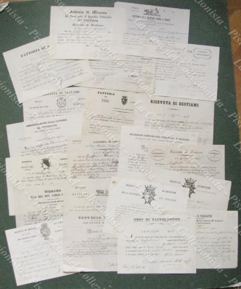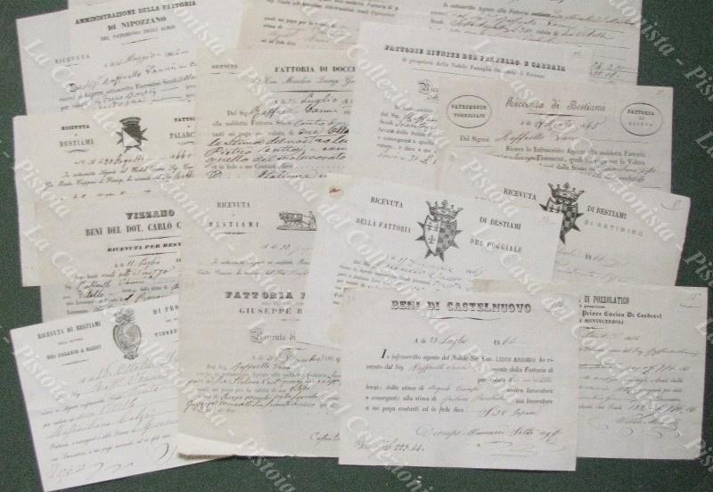 FATTORIE TOSCANE (dintorni Prato e Firenze). Raccolota di 21 ricevute degli anni '60 dell'800, molte con testatine incise. Fattorie di: S.Martino alla Palma, Nipozzano, Palarciano, Vizzano, Del Pino, Del Palagio a Campi, Doccia, S.Martino a Campi e Signa, Campi delle Monache di S.Martino, Pratello e Carraia, Quinto, Poggiale, Castelnuovo, Carmignano, Poggio Capponi, S.Moro, Mezzana, S.Martino sopra a Prato, Artimino, Pozzolatico. (Rif.E5386)