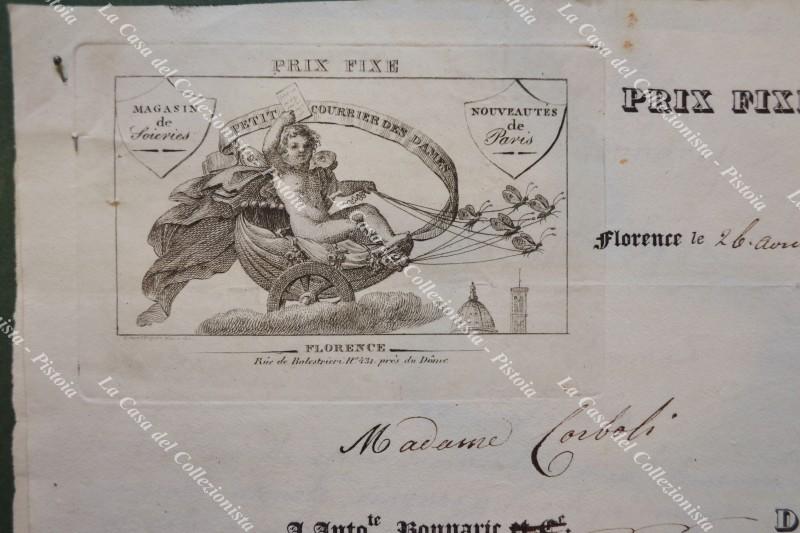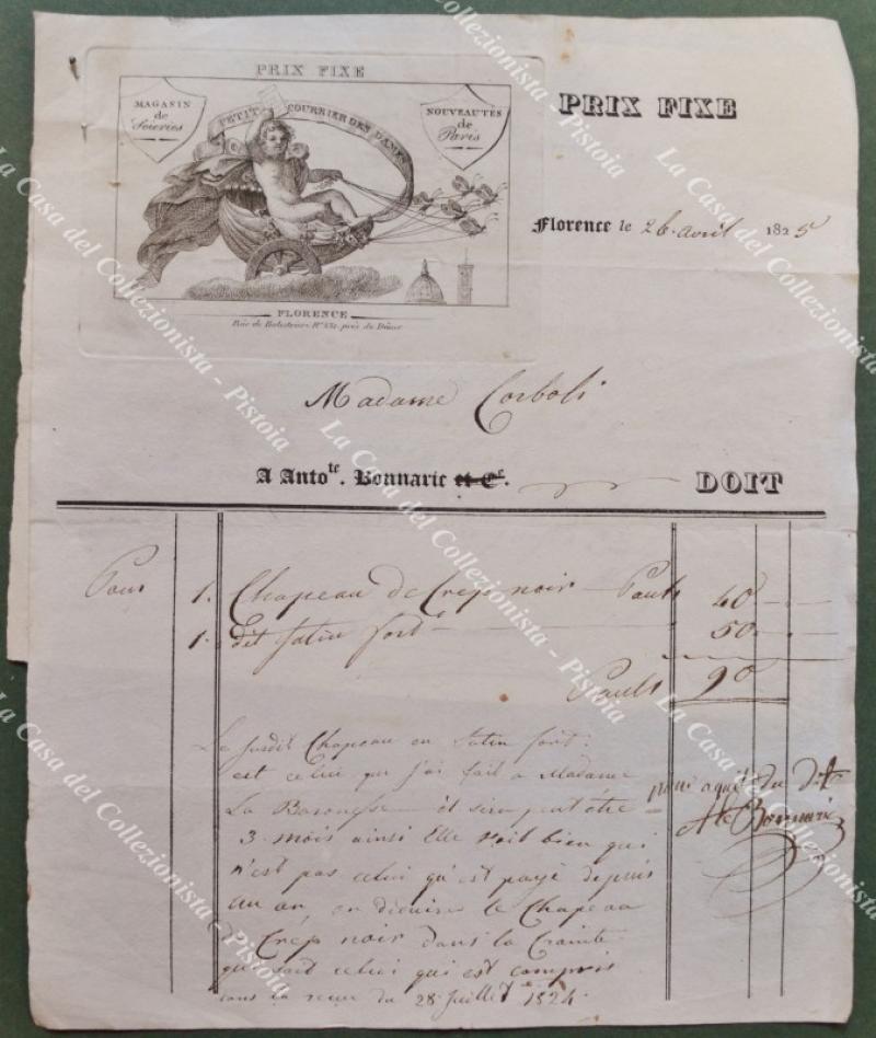 Firenze, via dei Balestrieri, anno 1825. Magasin de Soieries. Petit Courrier des Dames. Conto (di cm 21x26, con annessa quietanza) per l'acquisto due cappelli. Bella vignetta incisa all'acquaforte di cm 10x5,5. (Rif.F7050)