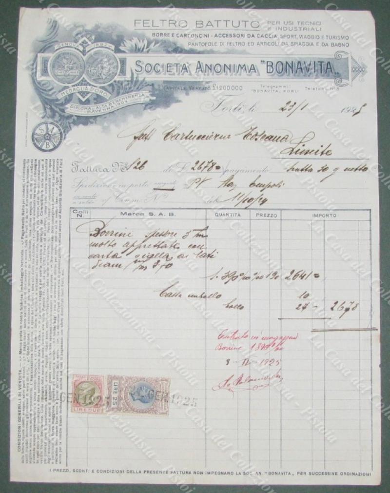 FORLI'. Soc. Anonima Bonavita. Vecchia fattura del 1925