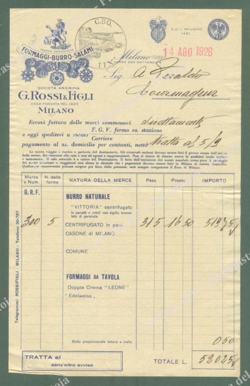 FORMAGGI BURRO SALAMI, Rossi e Figli, Milano. Vecchia fattura 1928