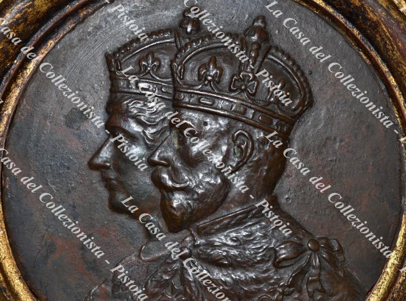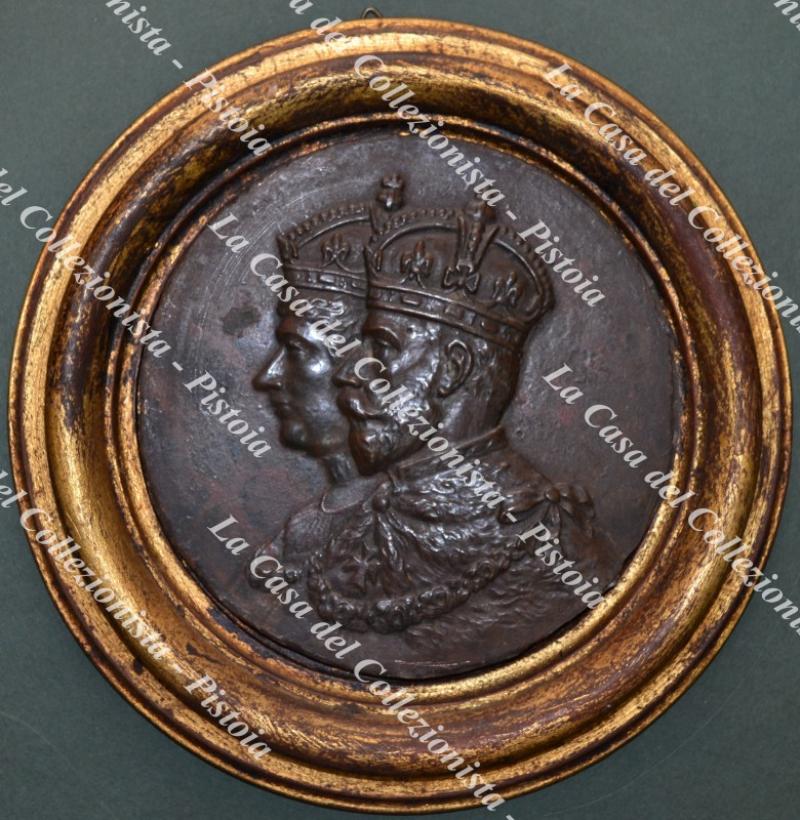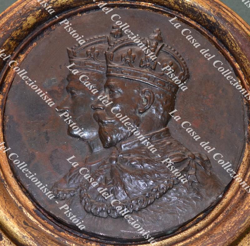 FUSIONE IN BRONZO di forma circolare (cm 12,6 di diametro) raffigurante, in rilievo, le effigi di Re GIORGIO V e della Principessa, sua consorte, MARIA DI TECK. Databile attorno al 1910 ha un peso di 618 grammi. Ottima conservazione. (Rif.D9822-153/73)