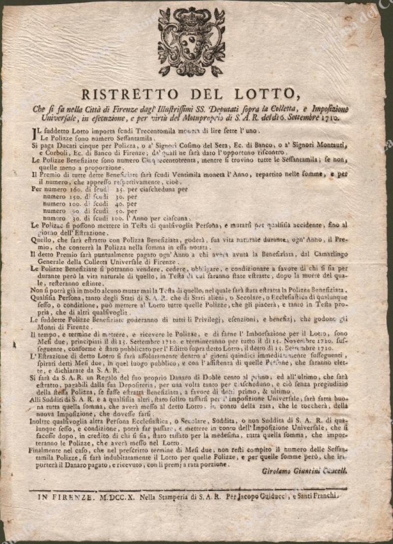 GIOCO DEL LOTTO. “RISTRETTO DEL LOTTO”. Importo totale, numero e prezzo delle polizze, entità dei premi, ecc.. Bando assai dettagliato dato in Firenze nel 1710. Stemma inciso, cm 22x30. Buona conservazione. (Rif.D6688-86/70)