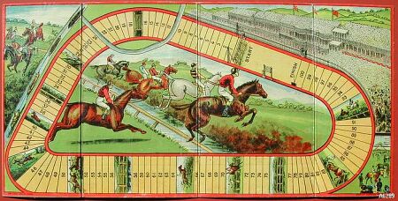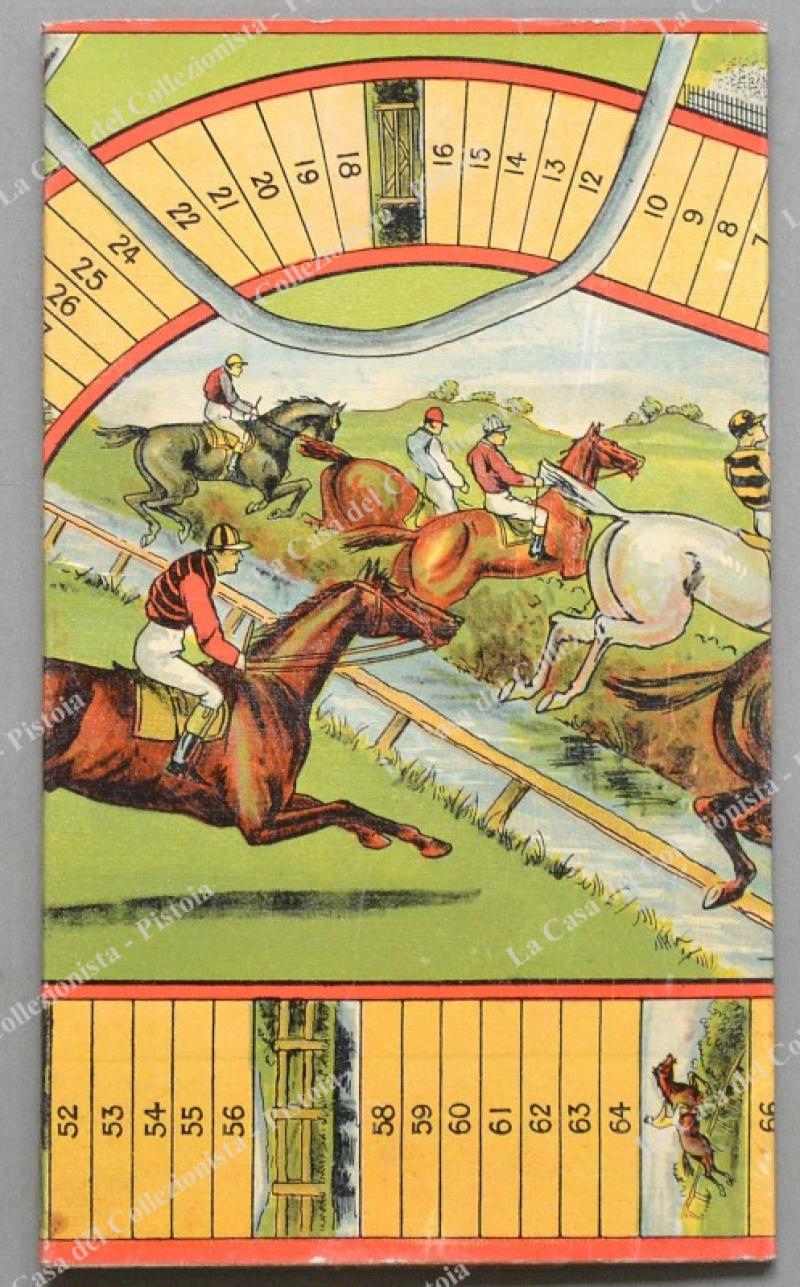 GIOCO DI PERCORSO di produzione inglese. Litografia a colori, databile all'inizio del 1900. Raffigura un ippodromo e cavalli in corsa. Ha 100 piccole caselle e misura cm 53x26. Ottima conservazione. (Rif.A6289-37/44)