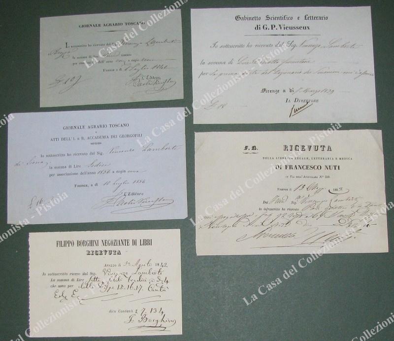 GIORNALI, LIBRAI E STAMPATORI FIORENTINI DELLA 1° META' '800. 5 ricevute a stampa e firmate