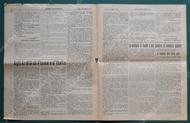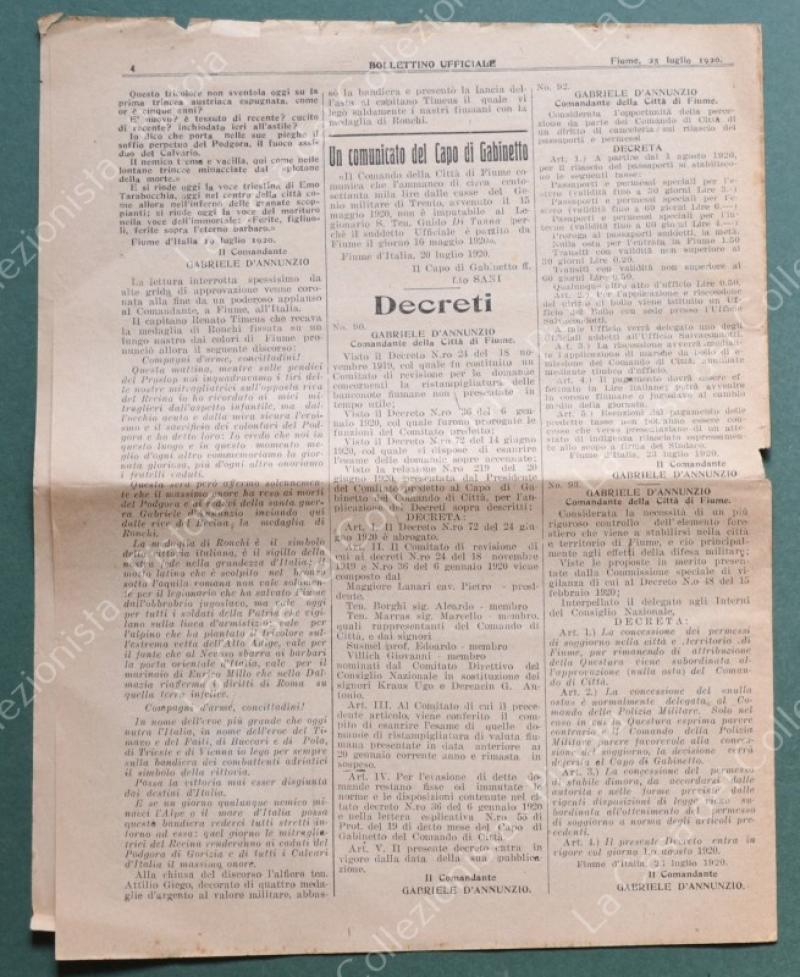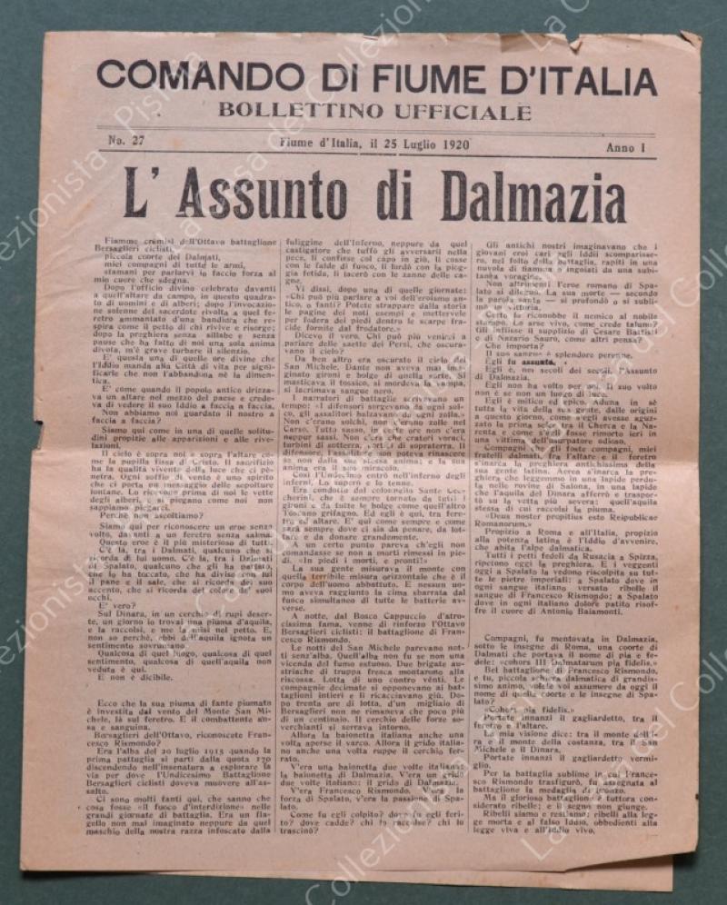Istria - Dalmazia. COMANDO DI FIUME. BOLLETTINO UFFICIALE. Anno primo n.27, 25 Luglio 1920. Cm 23x29, pagine 4, piccola mancanza lato sinistro. (Rif.F5406)
