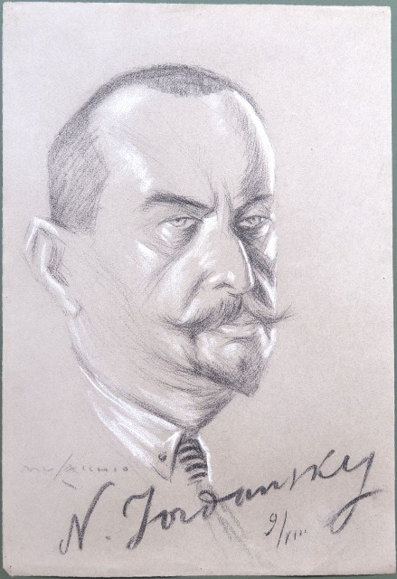 JORDANSKY N.. Ambasciatore russo a Roma. Partecipò, come inviato del Governo Sovietico, al Congresso di Losanna (24 luglio 1923) per l'accordo relativo alla Convenzione degli Stretti. Carboncino e biacca su cartoncino. Firmato Musacchio e con la firm